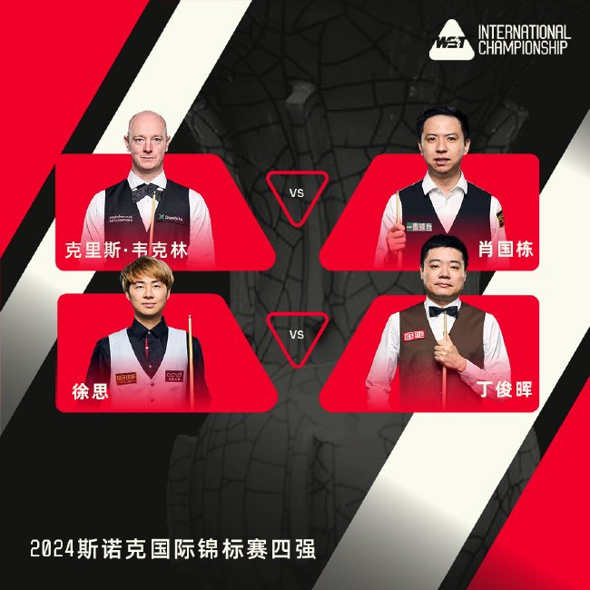 经过前5个比赛日的争夺,10号种子丁俊晖、肖国栋和徐思3位中国选手和英格兰独苗克里斯-韦克林闯入4强。半决赛对阵形势为肖国栋VS韦克林,丁俊晖VS徐思。半决赛赛制为17局9胜制,分为2个阶段进行。